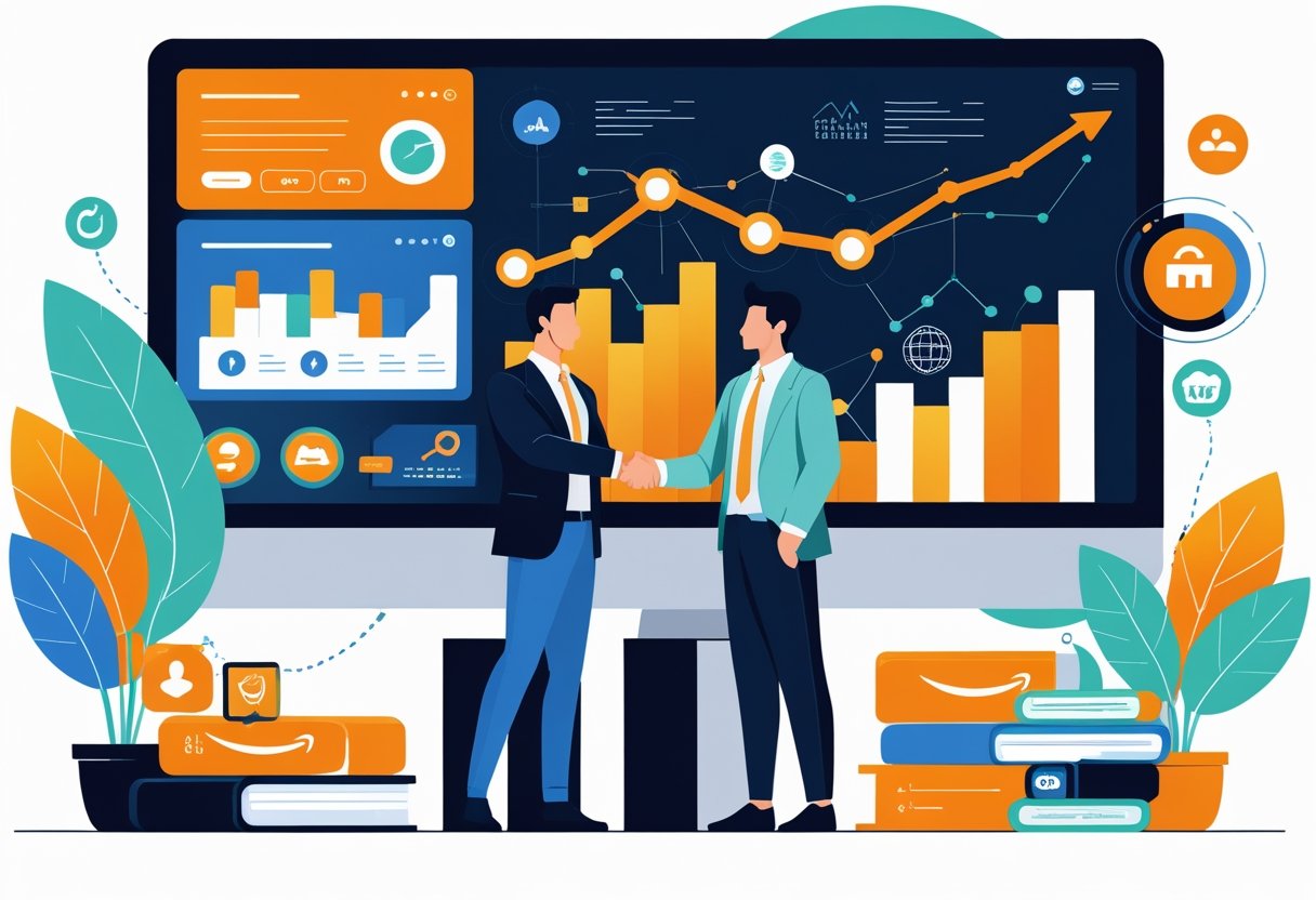Two professionals shaking hands in an office with digital charts and Amazon-related icons floating around, symbolizing a successful business partnership.
